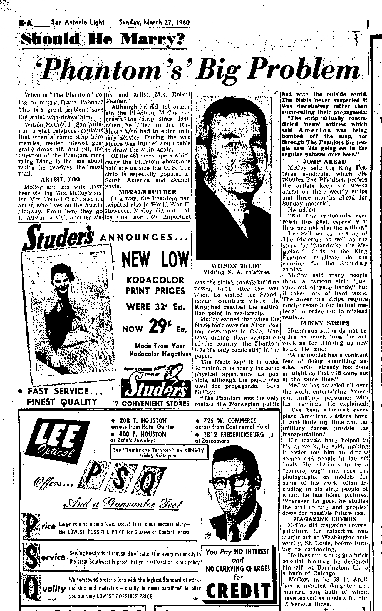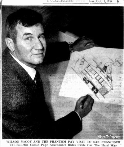 October 12, 1954 San Francisco Call-Bulletin photo of Wilson McCoy visiting the newspaper's offices, drawing The Phantom atop a runaway cable car!