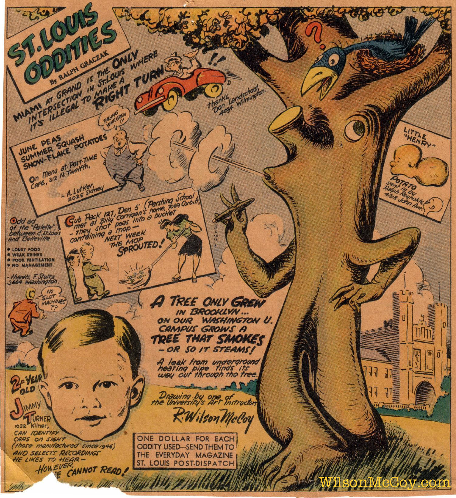 The long running St. Louis Post-Dispatch cartoon Our Own Oddities by Ralph Graczak began in 1940 as "Saint Louis Oddities." This cartoon features a smoking tree drawn by guest artist Wilson McCoy, who was an art instructor at Washington University at the time.